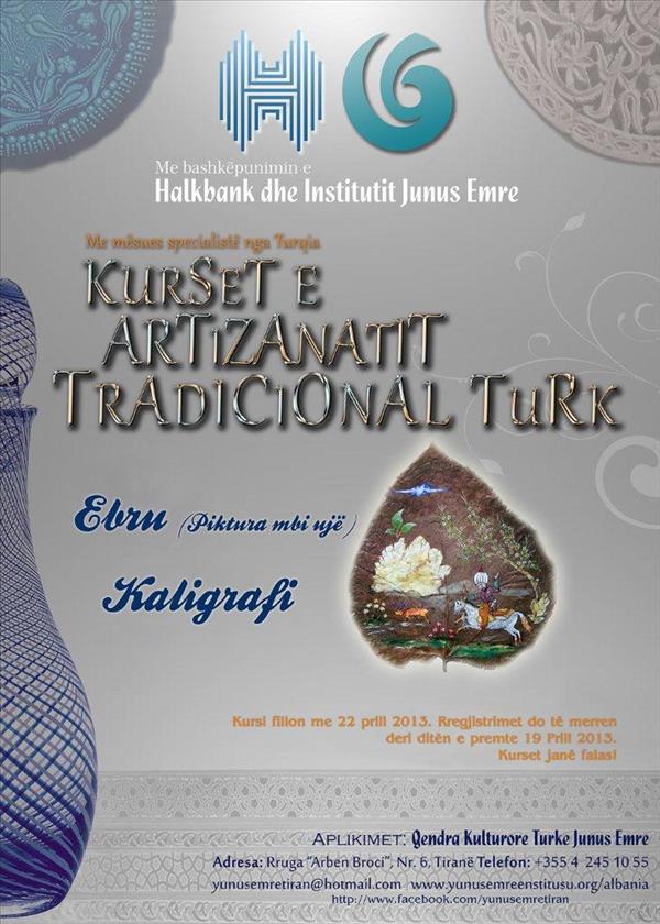 Yunus Emre Enstitüsü ve T.C. Halk Bankası işbirliği çerçevesinde yürütülen "Balkanlarda Kaybolmaya Yüz tutmuş El Sanatlarının İhyası Projesi" çerçevesinde Tiran Yunus Emre Türk Kültür Merkezi ve İşkodra YETKM Şubesi'nde "Ebru ve Hüsn-i Hat " kursları başlamıştır.