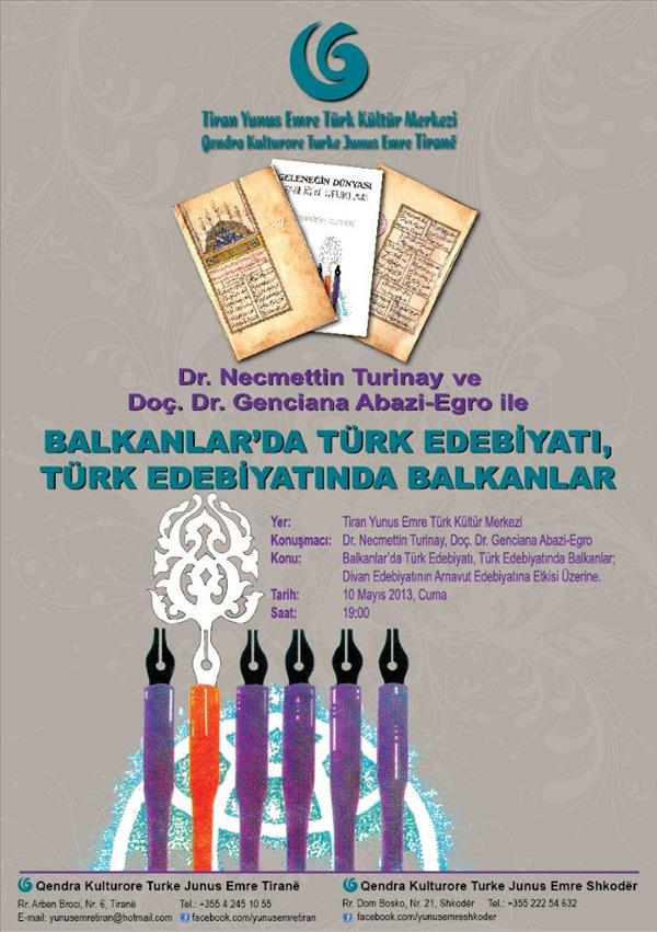 Tiran Yunus Emre Türk Kültürü Merkezi tarafından 10 Mayıs 2013, Cuma günü saat 19:00’da Dr. Necmettin Turinay ve Doç. Dr. Genciana Abazi-Egro’nun katılımıyla “Balkanlar’da Türk Edebiyatı, Türk Edebiyatında Balkanlar ve Divan Edebiyatının Arnavut Edebiyatına Etkisi Üzerine" bir söyleşi düzenlenecektir.