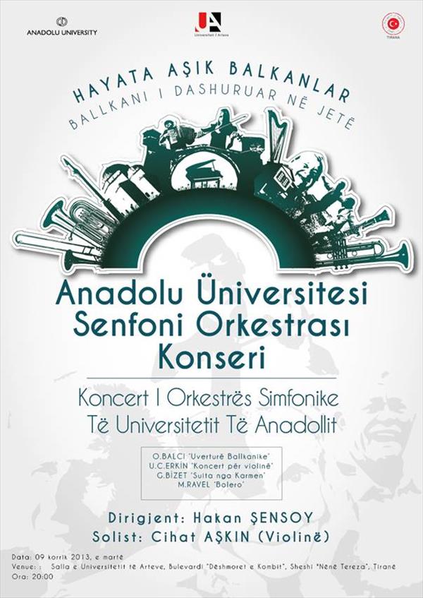 Anadolu Üniversitesi Senfoni Orkestrası 9 Temmuz 2013 Salı günü Tiran’da Güzel Sanatlar Üniversitesi Salonunda 75 kişilik büyük ekibiyle Türk ve Batılı bestecilerin eserlerinden oluşan repertuarını “Hayata Aşık Balkanlar” teması altında icra edecektir.
