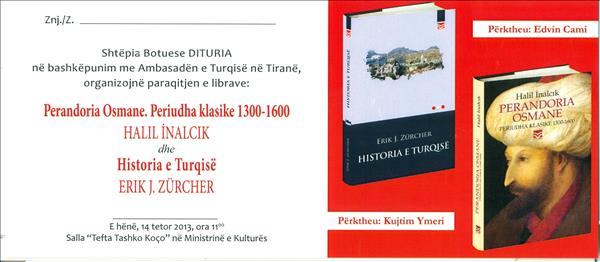 Saygıdeğer Toplum Üyelerimiz, Arnavutça’ya yeni çevrilmiş olan Prof. Dr. Halil İnalcık’ın “Osmanlı İmparatorluğu Klasik Çağ (1300-1600) ve Erik J. Zürcher’in “Modernleşen Türkiye’nin Tarihi” adlı kitapların tanıtımı, 14 Ekim 2013 Pazartesi günü saat 11’de Kültür Bakanlığı “Tefta Tashko Koço” Salonunda gerçekleştirilecektir. İlgilenen toplum üyelerimize saygıyla duyurulur. |