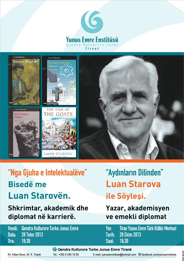 Tiran Yunus Emre Türk Kültür Merkezi’nin “Aydınların Dilinden” adlı faaliyeti kapsamında 28 Ekim, Pazartesi günü Tiran Yunus Emre Türk Kültür Merkezi’nde saat 18.30’da Luan Starova ile bir söyleşi gerçekleştirilecektir.