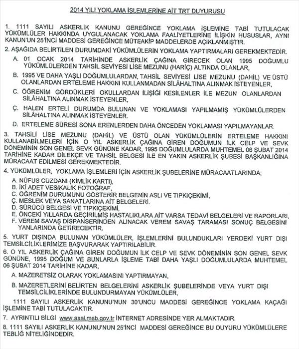 1111 sayılı Askerlik Kanunu gereğince, 1995 doğumlu ve 1995 doğumlularla birlikte işleme tabi yükümlüler için yoklama işlemlerine ait tebliğ yerine geçecek duyuruaşağıda sunulmaktadır.