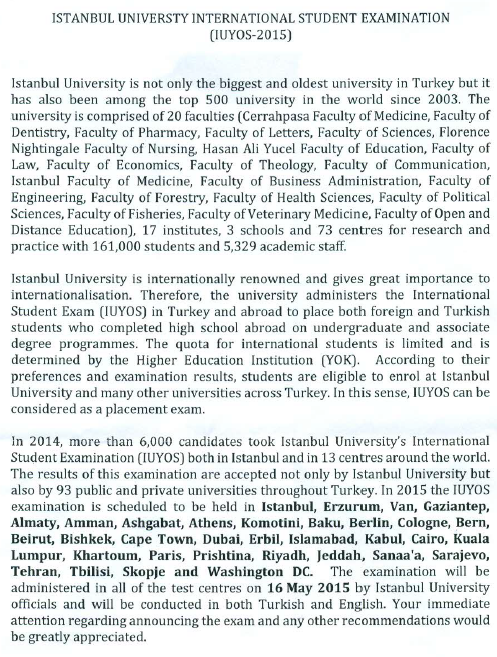 Universiteti i Stambollit do te organizoje “Provimin Nderkombetar te Studenteve” (İÜYÖS) ne qendrat e provimit qe do te hapen brenda Turqise dhe jashte saj. Ne kete provim do te mund te marrin pjesestudentet e huaj, si dhe studentet me shtetesi turke te cilet e kane mbaruar shkollen e mesme jashte Republikes se Turqise. Ky provim organizohet qe keta studente te sitemohen ne nivel parauniversitar dhe universitar.