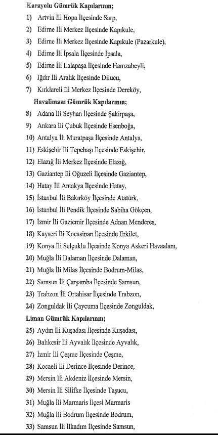 Milletvekili seçimlerinin yapılacağı gümrük kapılarının listesi ekte sunulmakta olup, anılan gümrük kapılarında oy verme işlemi 8 Mayıs 2015 Cuma günü saat 08:00'de başlayacak ve 7 Haziran 2015 Pazar günü saat 17:00'de sona erecektir.